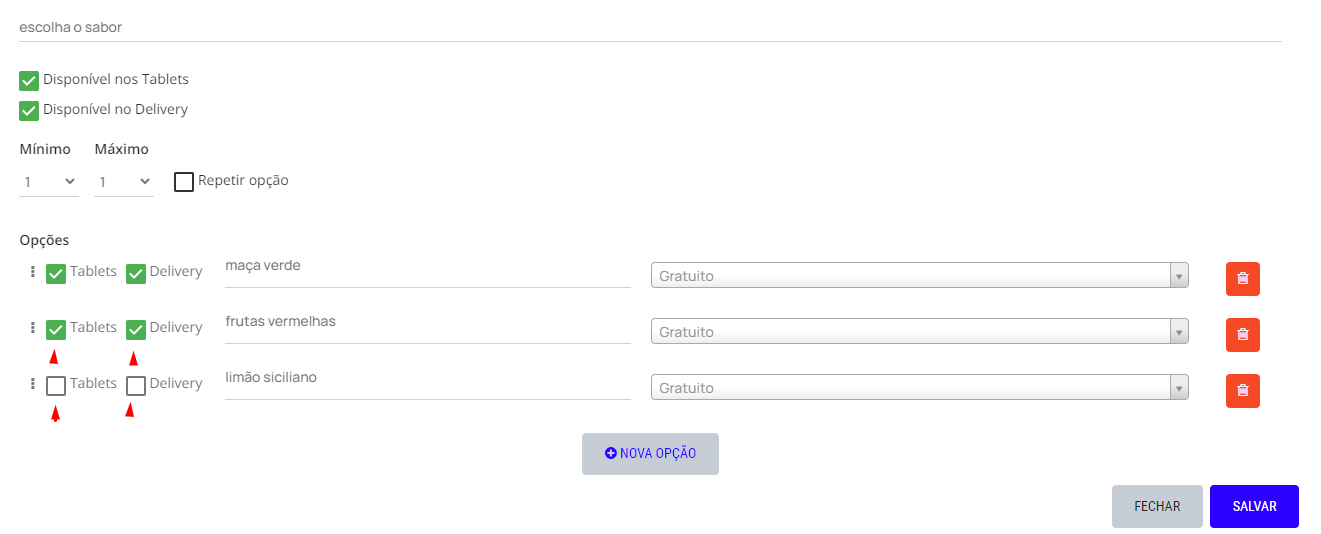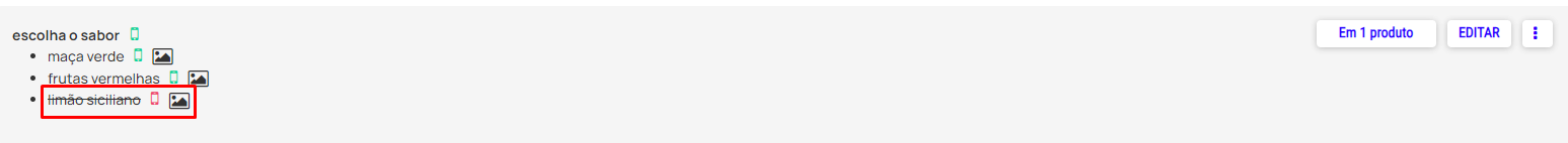 Agora o opcional aparecerá como riscado e com o ícone do celular em vermelho: