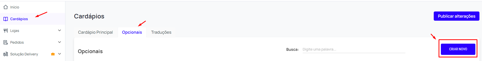 Este procedimento é feito em **Cardápios** na aba de **Opcionais**: