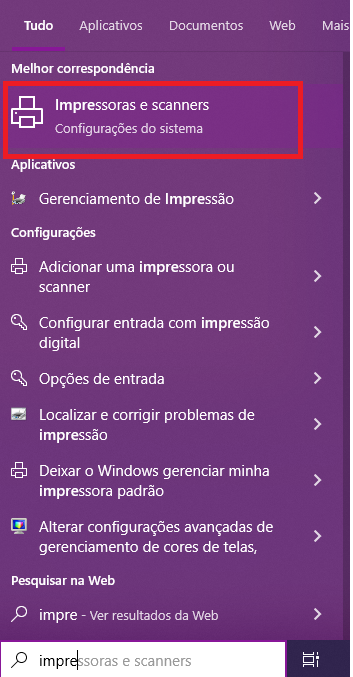 * Digitar no campo de busca **Impressoras e Scanners**&#x20;